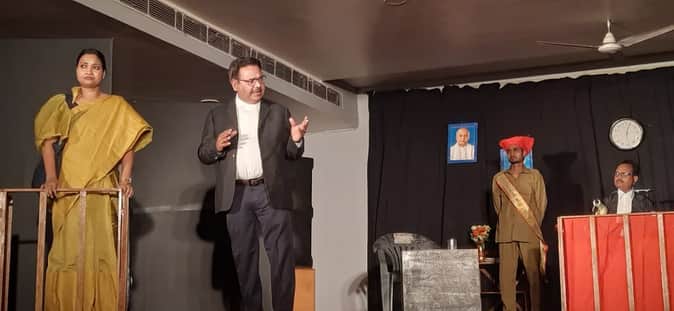 उत्सव-ए-रंगमंच कार्यक्रम में नाटक मंचन के दौरान अदालत में दलील करते कलाकार। स्रोत संस्था
