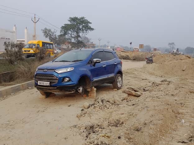 पटहेरिया-रजवटिया के बीच हाइवे पर बनें मिट्टी के अस्थायी डाइवर्जन को पार कर गड्ढे में गिरी कार।स