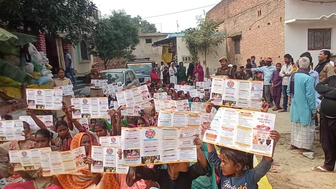 मेंहदावल के कुसौना मे महिला जागरूकता पर कार्यक्रम में पंपलेट के साथ मौजूद महिलाए-संवाद