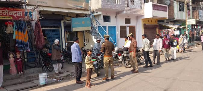 मेंहदावल कस्बे में अतिक्रमण हटवाते हुए पुलिस व नगर पंचायत प्रशासन के लोग । संवाद