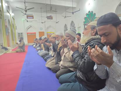 मदनी मस्जिद सेमरियावां में मगरिब की नमाज के बाद मगफिरत की दुआ करते लोग-संवाद