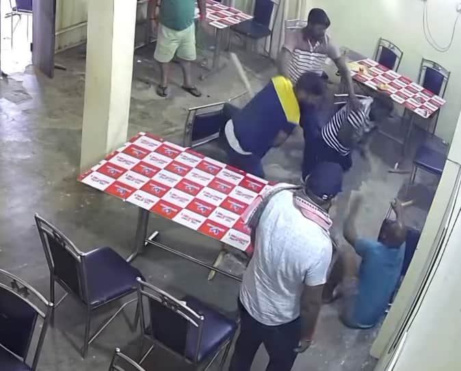 वायरल वीडियो जिसमें आसमानी कपड़ा पहने आलोक की पिटाई कर रहे हैं संतोष और उसके समर्थक । स्रोत - स