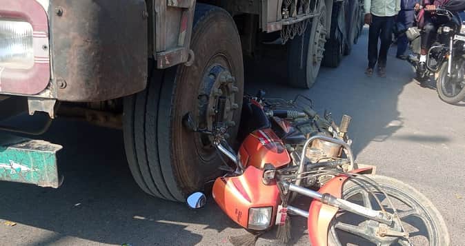 जलालाबाद में ट्रक के अगले पहिये मे फंसी बाइक। संवाद