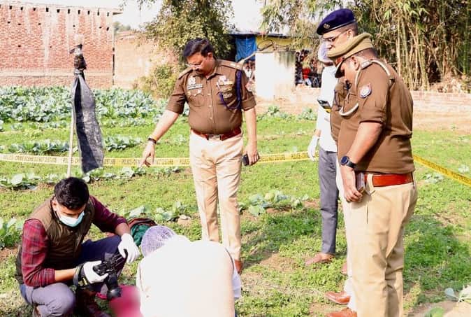 सेहरामऊ दक्षिणी में घटनास्थल पर साक्ष्य जुटाती टीम व साथ में खड़े एसपी राजेश द्विवेदी। स्रोत: