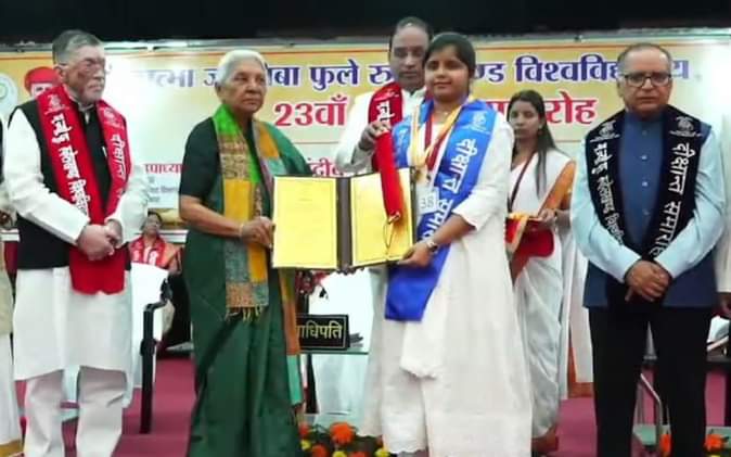 बरेली में दीक्षांत समारोह में टॉपर दिव्यांशी सिंह को गोल्ड मेडल प्रदान करतीं राज्यपाल आनंदी बेन