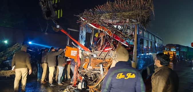 मीरानपुर कटरा में हाईवे पर हापुड़ डिपो की बस व गन्ने से भरी ट्रैक्टर-ट्रॉली टकराने के बाद पहुंच