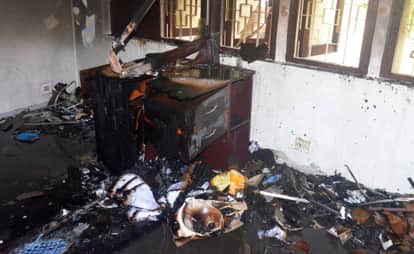 विकास भवन स्थित नवनिर्मित मनरेगा कार्यालय में आग लगने से जला फर्नीचर। संवाद