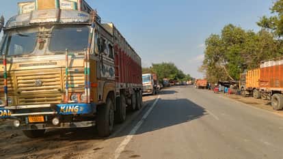 लखनऊ-दिल्ली नेशनल हाईवे पर रोजा क्षेत्र में सड़क पर खड़े ट्रक। संवाद