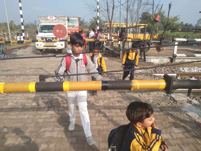 निगोही में बंद क्रॉसिंग से गुजरते बच्चे। संवाद