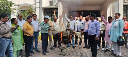 बीएसए कार्यालय में भ्रष्टाचार का पुतला जलाते शिक्षक संगठनाें के पदाधिकारी। संवाद