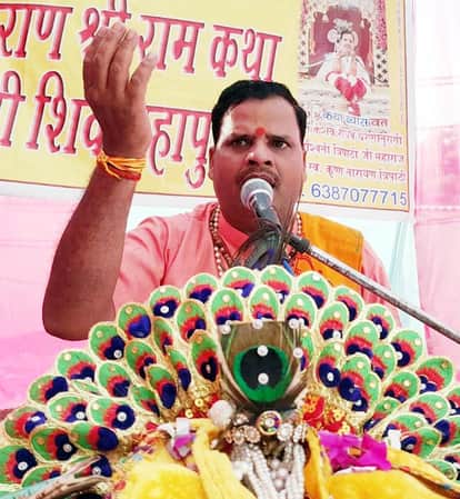 खुटार के देवस्थान मंदिर परिसर में कथा सुनाते अश्विनी त्रिपाठी। संवाद