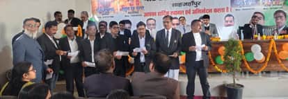 तिलहर में बार एसोसिएशन सभागार में जनपद न्यायाधीश विष्णुदेव शर्मा के सामने शपथ लेते नवमनोनीत पदा