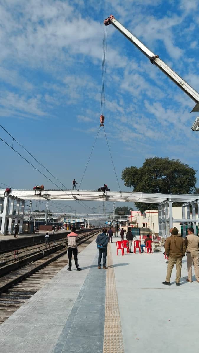 शाहजहांपुर में रेलवे स्टेशन पर क्रेन से गर्डर रखते रेलवे कर्मी। स्रोत: रेलवे