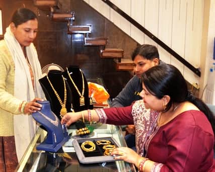 सदर बाजार स्थित एक शोरूम पर गहनों की खरीदारी करते लोग। संवाद