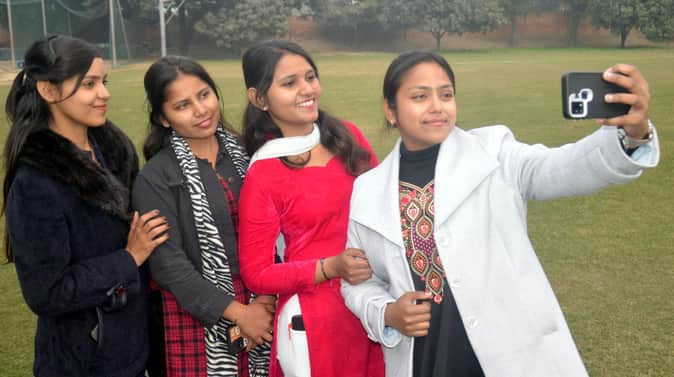 शामली के बीएसएम स्कूल में धूप निकलने पर ग्राउड़ में मोबाइल से सेल्फी लेती छात्राएं । संवाद
