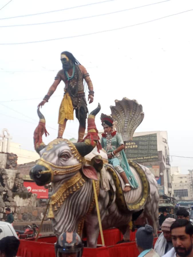 शामली में संत नामदेव जन्मोत्सव पर शोभायात्रा में भोले शंकर की वेष -भूषा में नृत्य करते कलाकार ।