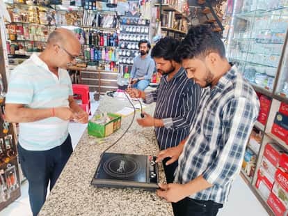 गैस की किल्लत के चलते बर्तन की दुकान पर इंडक्शन हीटर देखते युवक. संवाद