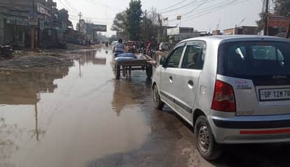 शामली में कैराना रोड पर जलभराव में जाते वाहन । संवाद