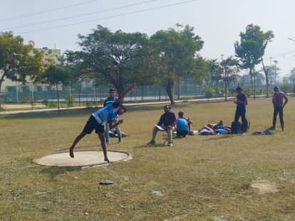 स्पोर्ट्स स्टेडियम में आयोजित चयन ट्रायल में गोला फेंकता खिलाड़ी। - स्रोत: विभाग