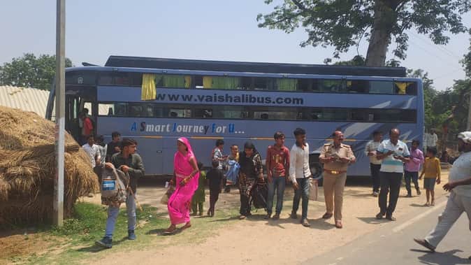 बाइक सवार को टक्कर मारने वाली बस को पकड़कर जांच करते उपनिरीक्षक व उतरते यात्री।
