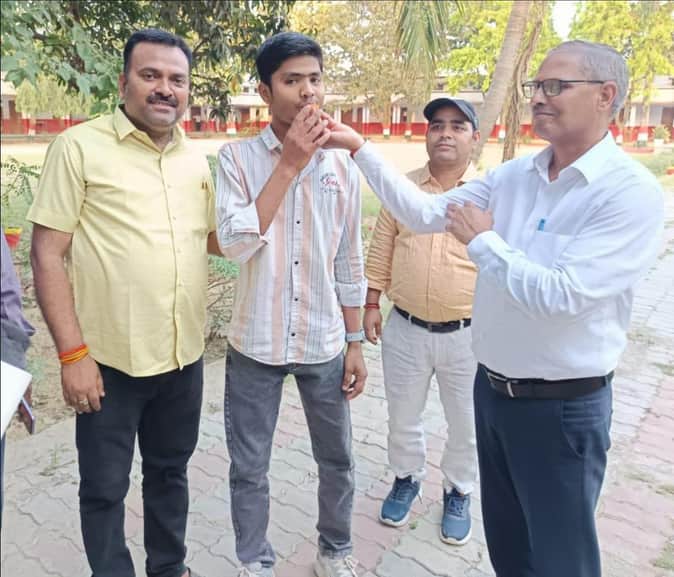- फोटो : जगतजीत इंटर कॉलेज में अमर प्रकाश को मिठाई खिलाते प्रधानाचार्य।