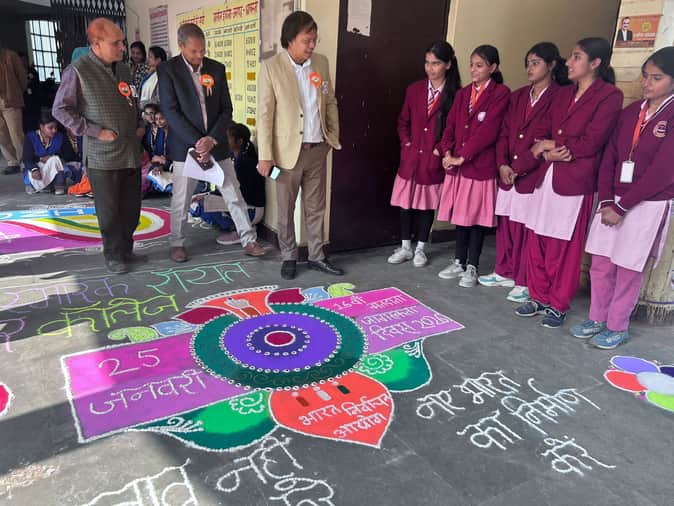 जगतजीत इंटर कॉलेज में रंगोली को देखते एसडीएम व अन्य।- संवाद