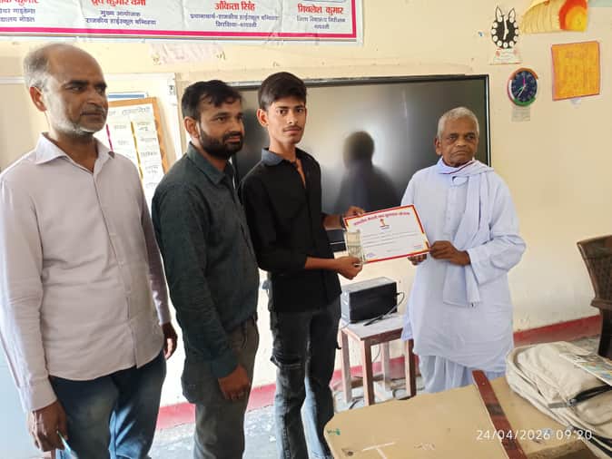 हाईस्कूल के टॉपर को रुपये व प्रमाण पत्र देते सेवानिवृत्त शिक्षक प्रेम सागर वर्मा।