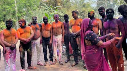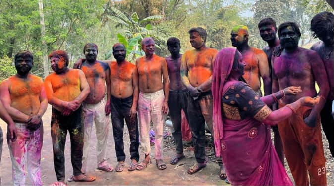 गिलौला के तुलसीपुरवा में रंग खेलते लोग।- संवाद