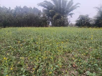 सरसो के फसल में लगे फूल व छाए बादल।
