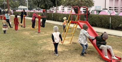 विद्यालय छुट्टी होने पर मेडिकल कॉलेज के परिसर में स्थित पार्क में झूले का आनंद लेते बच्चे। सं
