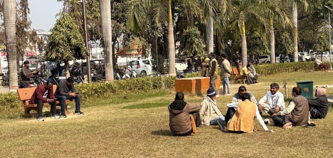 गार्डन में बैठकर धूप का आनंद लेते लोग