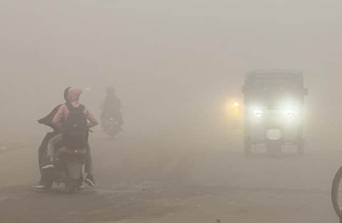 शहर में कोहरे के दौरान आवागमन करते वाहन चालक। संवाद