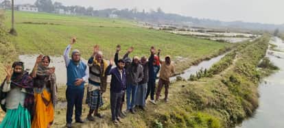 बढ़नी के ग्राम पंचायत औरहवा से गुजरी राप्ती माइनर नहर के पास नारे बाजी करते ग्रामीण। संवाद