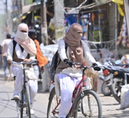 दोपहर की तेज धूप में शहर के सिद्धार्थ तिराहे पर कपड़े से चेहरा टक्कर आते-जाते दिखे लोग।