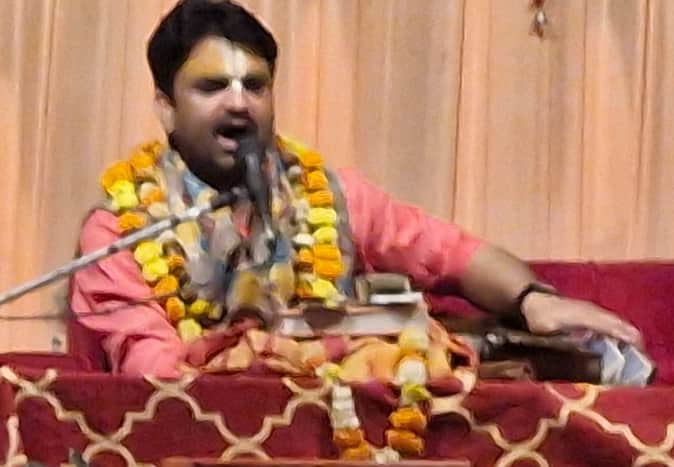 पथरा क्षेत्र के ग्राम पेड़ार में राम कथा सुनाते गौरव कृष्ण शास्त्री। स्रोत विज्ञप्ति