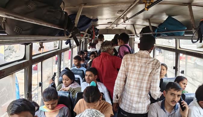 रोड़वेज बस में खड़े परीक्षार्थी।