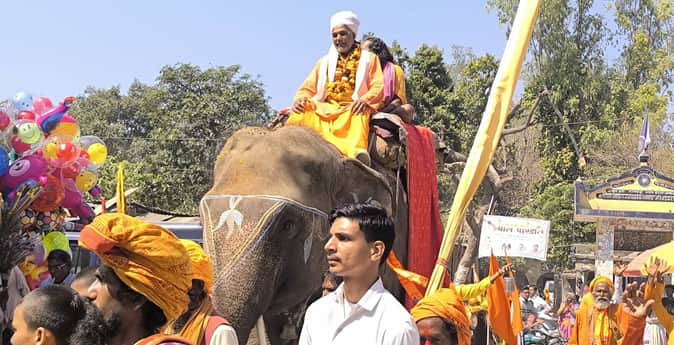 परिक्रमा में हाथी पर सवार होकर पहुंचे संत।