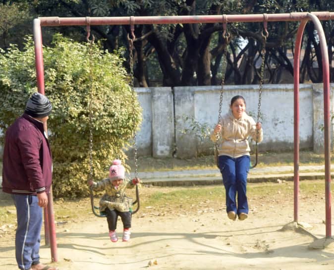 सरोजनी वाटिका पार्क में झूला झूलते बच्चे।