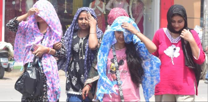 धूप से बचने के लिए दुपट्टे से चेहरा ढंककर जातीं युवतियां। संवाद