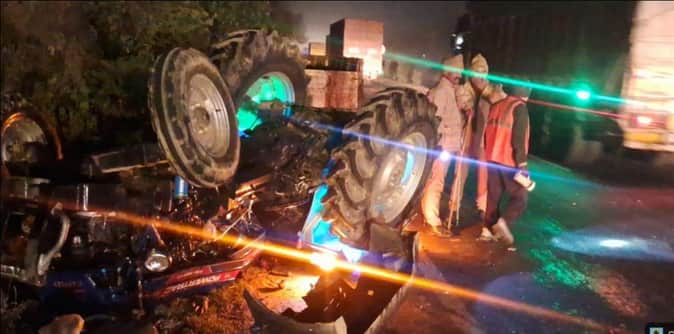 ट्रक की टक्कर के बाद पलटी ट्राली।
