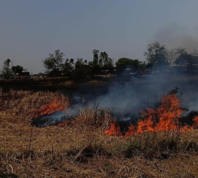 घोरावल के ऊंचका गांव में आग से जलती गेहूं की फ़सल।