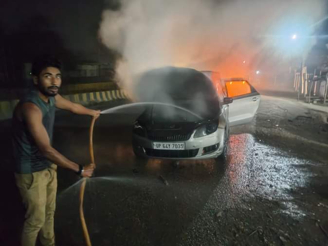 शक्तिनगर वाराणसी राजमार्ग सलखन में कार में लगी आग को बुझाता युवक। स्रोत जागरूृक पाठक