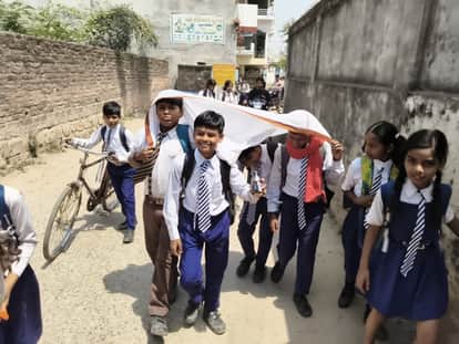 रॉबर्ट्सगंज में प्रचंड धूप से बचने के लिए गमछा ओढकर स्कूल से घर जलाते बच्चें।