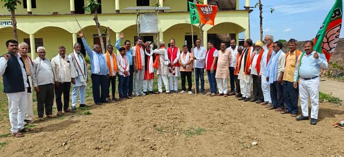 मधुपुर मंडल में स्थापना दिवस पर पार्टी का झंडा लगाते भाजपा कार्यकर्ता। स्रोत स्वयं