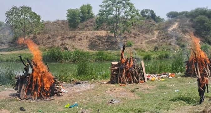 कोन के पांडु नदी के किनारे एक साथ जलते छतीसगढ़ हादसे में मृतकों के शव