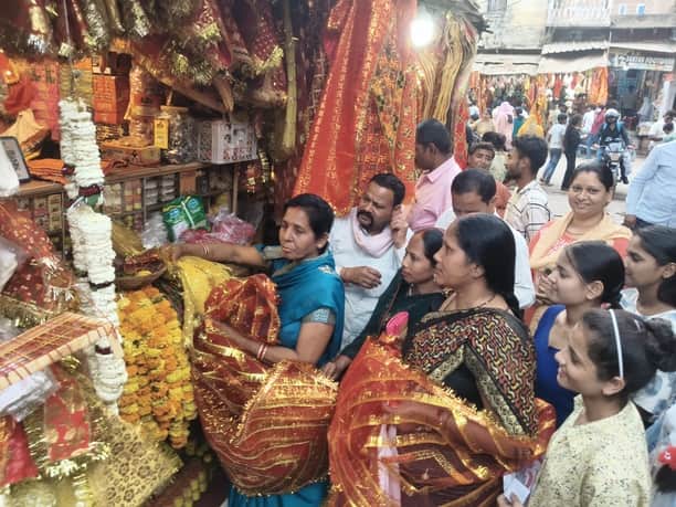 रॉबर्ट्सगंज शीतला माता मंदिर के समीप पूजन सामग्री की खरीदारी करती महिलाएं। संवाद