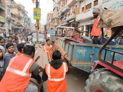 शहर के ठठेरीबाजार में ट्रैक्टर पर सामान रखते पालिका कर्मी। स्रोत-नगर पालिका