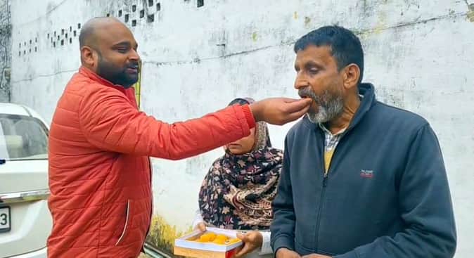 अलहदादपुर स्थित आवास में पिता मो. सलीम को मिठाई खिलाकर खुशी जताते पुत्र मुनौव्वर।