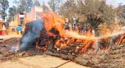 Sultanpur News: राजस्व टीम के सामने छप्पर में लगाई आग