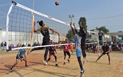 वॉलीबॉल प्रतियोगिता में खेलती डीवीए सुल्तानपुर व अयोध्या की टीम।